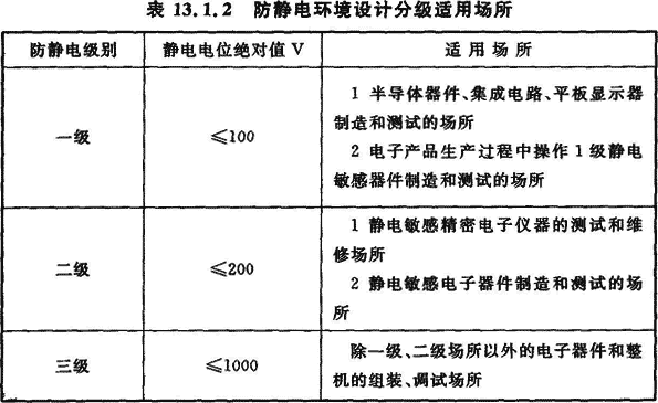 13.1.2 防靜電環(huán)境設(shè)計應(yīng)按電子產(chǎn)品或生產(chǎn)工序(設(shè)備)進(jìn)行分級。防靜電環(huán)境內(nèi)靜電電位絕對值應(yīng)小于電子產(chǎn)品的靜電電位安全值。防靜電環(huán)境設(shè)計應(yīng)分為三級,防靜電環(huán)境設(shè)計分級適用場所應(yīng)符合表13.1.2的要求。