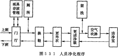 5.3.1 人員凈化用室和設(shè)施應(yīng)根據(jù)潔凈室的規(guī)模、空氣潔凈度等級設(shè)置,并應(yīng)設(shè)置生活用室。人員凈化用室宜按圖5.3.1的人員凈化程序進行布置。