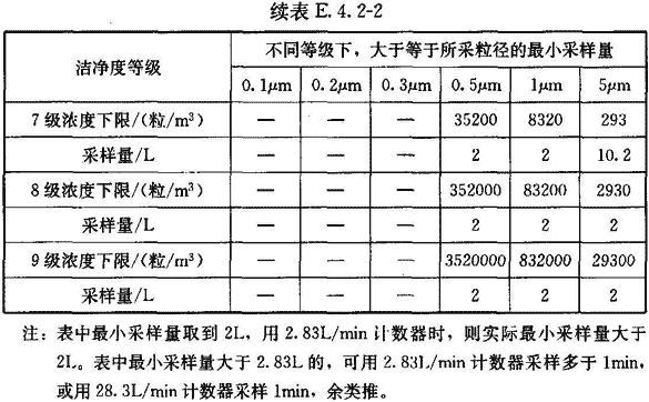4 每點(diǎn)采樣1次,如工藝無(wú)特殊要求,每次采樣量應(yīng)大于等于表E.8.4推薦的浮游菌最小采樣量。