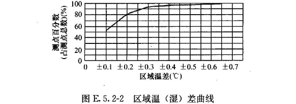 區(qū)域溫差、區(qū)域相對(duì)濕度差:按測(cè)點(diǎn)中最低或最高的一次測(cè)定值與各測(cè)點(diǎn)平均溫度和平均相對(duì)濕度的差值的測(cè)點(diǎn)數(shù),占測(cè)點(diǎn)總數(shù)的百分比,整理成累計(jì)統(tǒng)計(jì)曲線(圖E.5.2—2)。
