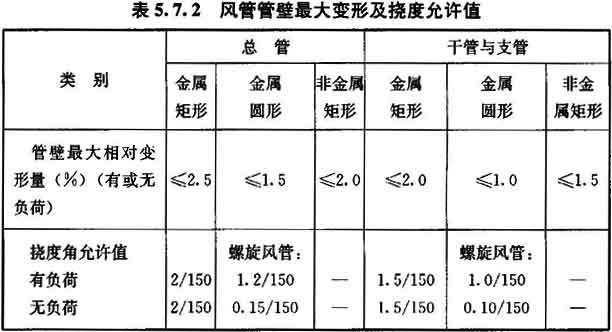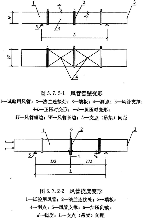 10 外購成品風(fēng)管應(yīng)有變形試驗。風(fēng)管管壁最大變形相對量(表面最大不平度b與風(fēng)管短邊長度H之比,圖5.7.2—1)及撓度角允許值[兩段風(fēng)管組合件中央連接法蘭部位的撓度量d與該兩風(fēng)管組合的兩吊架(支點)間距一半L/2之比,見圖5.7.2—2]應(yīng)符合表5.7.2的規(guī)定。